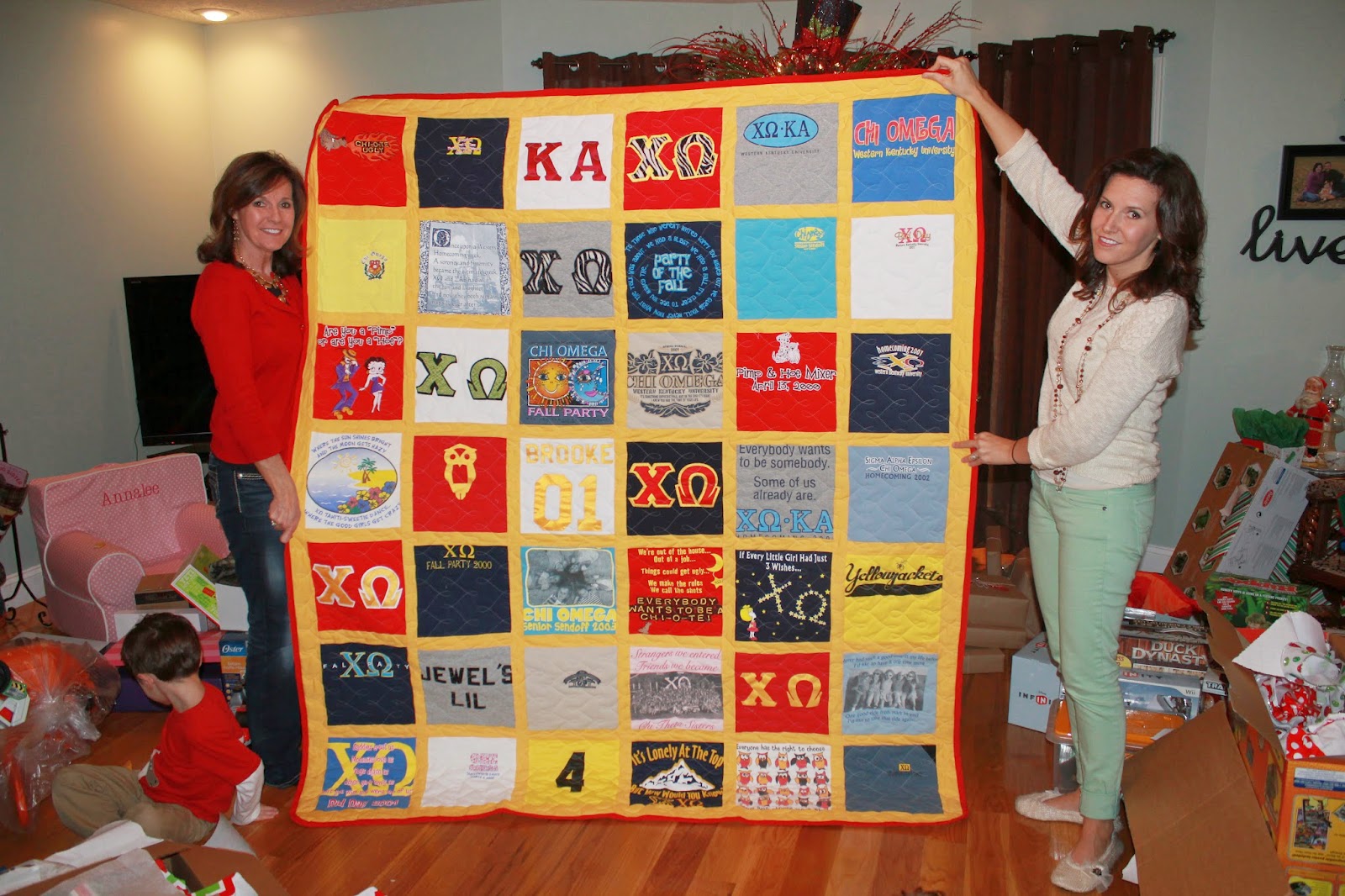 Our first stop was MimMim and Paps, and Good Lord at the presents. Can't wait to see what it looks like next year with two more babies! They sure get spoiled here (in more ways than gifts, mind you)Possibly my favorite gift ever received -- Mom MADE this quilt herself out of my old Chi Omega t-shirts. I know it had to take her forever to make it. Super love it.